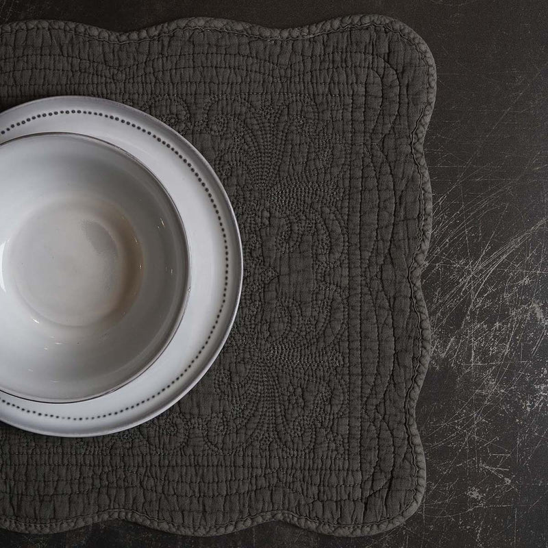 Handcrafted cotton quilted placemat in washed grey, it features geometric pattern and a scalloped edge. These are soft and durable just perfect to protect your table and enhance your décor.